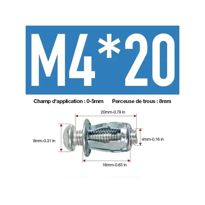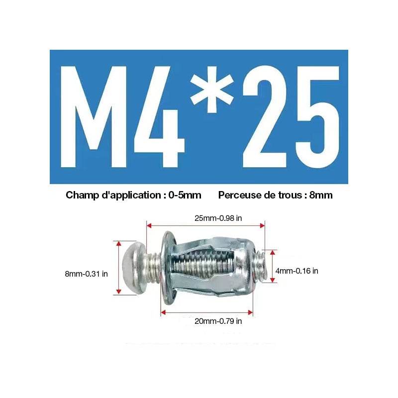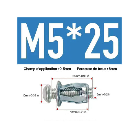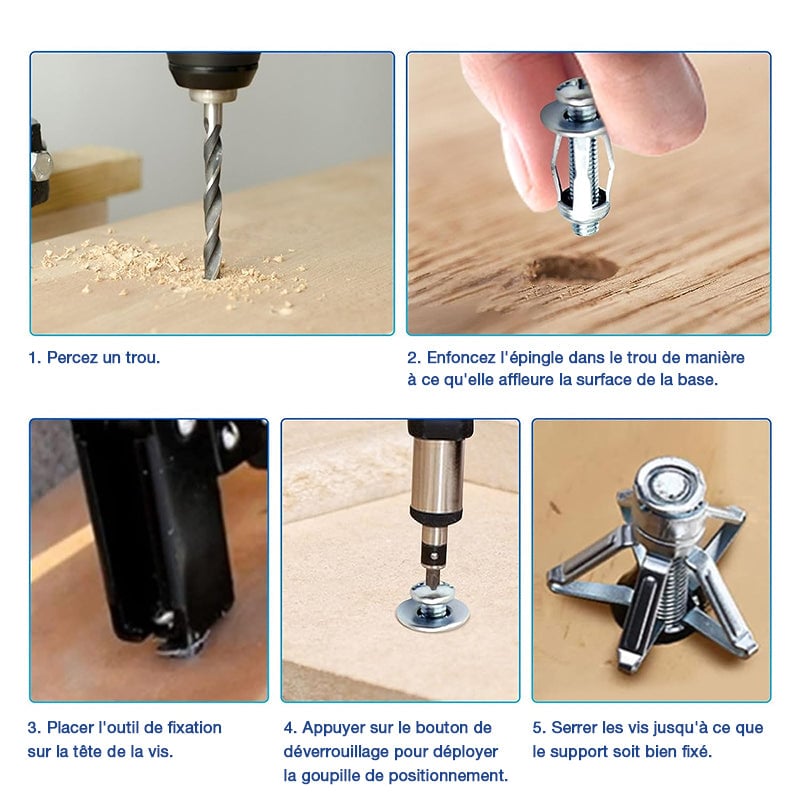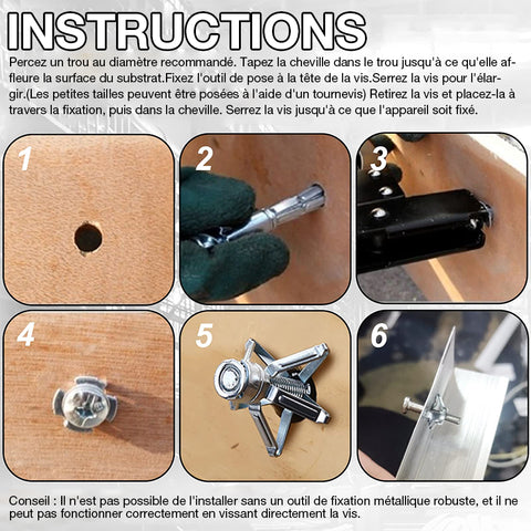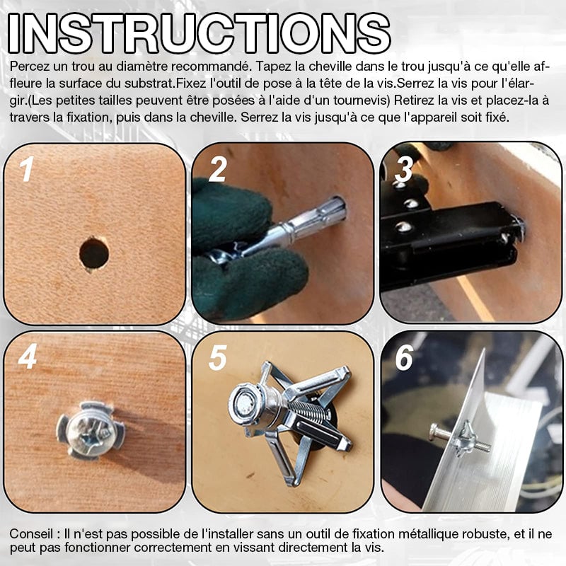 ✅ Facile à utiliser : 1. Percez un trou au diamètre recommandé. 2. Enfoncez l'ancre dans le trou jusqu'à ce qu'elle affleure la surface du substrat. 3. Fixez l'outil de réglage à la tête de la vis. Pressez pour élargir l'ancrage. (Les petites tailles peuvent être réglées à l'aide d'un tournevis) 4. Retirez la vis et placez-la à travers le luminaire, puis de nouveau dans l'ancrage. Serrez la vis jusqu'à ce que le luminaire soit fixé.