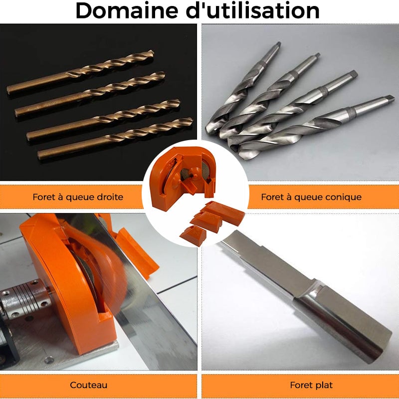 L'affûteuse de mèches est principalement utilisée pour affûter les mèches de type fer et les autres mèches à haute résistance ne conviennent pas à l'utilisation de ce produit. Cet outil vous évite de dépenser de l'argent et du temps pour remplacer vos mèches usées.